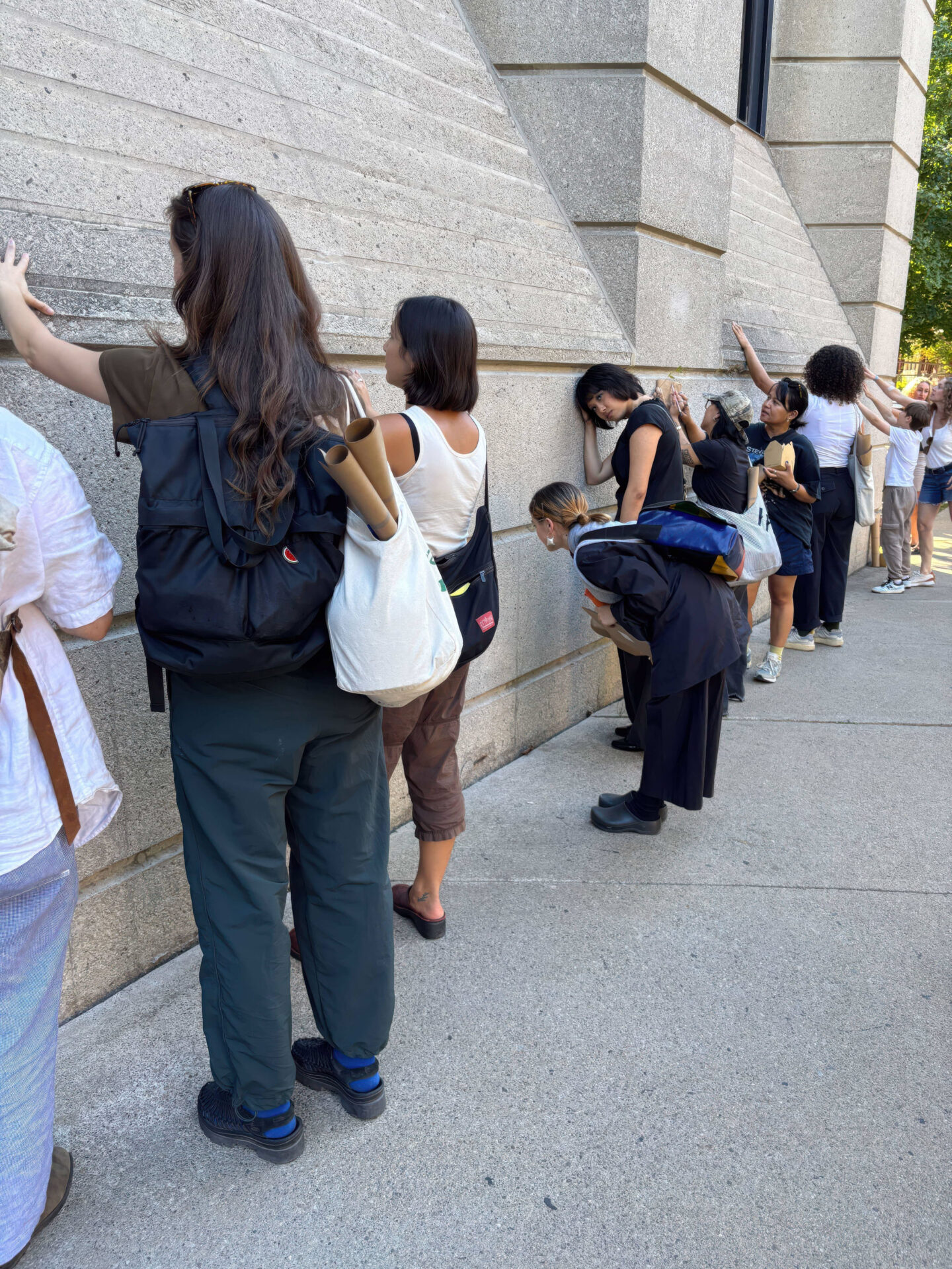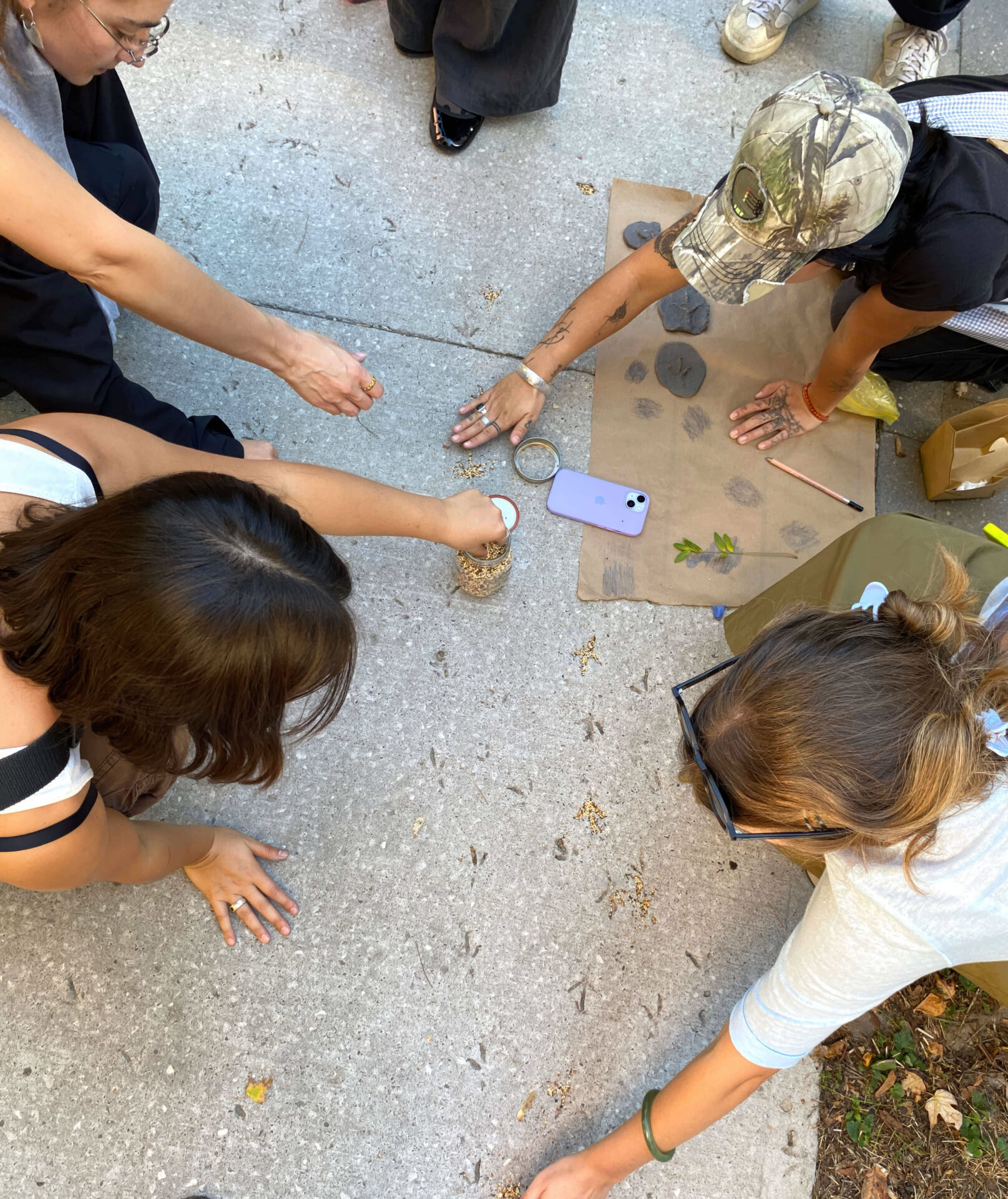 Along the way, we sought to attune our attention, our noticing, differently, so that we might begin to sense differently. Disrupting what is ordinarily knowable in urban space, the group attended to what beings, forces, and histories are affirmed/effaced by the shape our relations take in the concrete-bounded environment. Garden-Smith and Fox shared various stories and material lines of inquiry while inviting participants into exercises such as the creation of rubbings, tracings, and clay impressions that allowed us to deepen our pause and sensorial attunement.